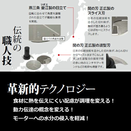 ●職人の伝統が息づく街「燕三条」の目立て技術を生かし、回転に合わせて角度を調整した壷江作のおろしディスクが、繊細な食感を実現します。