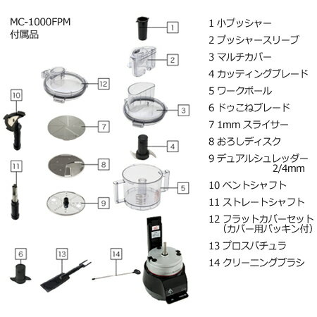 ●付属品・小プッシャー・プッシャースリーブ・マルチカバー・カッティングブレード(正広)・ワークボール2個・ドゥこねブレード・1mmスライサー(正広)・おろしディスク(壷江)・デュアルシュレッダー2/4mm・ベントシャフト・ストレートシャフト・フラットカバーセット(カバー用パッキン付き)・プロスパチュラ・クリーニングブラシ●電源:単相100V 50/60Hz●消費電力:360/430W●回転数:約1,500/1,800回/分【cookcook、クッククック、厨房用品、厨房機器・設備、ミキサー・ブレンダー、エスシーテクノ、エス・シー・テクノ、原産地:中国、MC-1000FPM、6-0579-0201、5-0517-0701、CML2801、CML-28、エスシーテクノ、SCテクノ、クイジナート、DLC-N7JPG、ロボクープ、ホテル、レストラン、和食、割烹、病院、施設、保育、幼稚園、学校、嚥下調整食、ペースト、ピューレ、おかゆ、エマルジョン化、乳化、パン生地、ミンチ、すりつぶし、みじん切り、粉砕、混ぜる、短冊】▼こちらもどうぞ▼マルチシェフ フードプロセッサー MC-1000FPS 中型 標準タイプマルチシェフ フードプロセッサー MC-1500FPM 中型 多機能タイプマルチシェフ フードプロセッサー MC-1500FPS 中型 標準タイプマルチシェフ ブレンダー MC-2000BL 強化樹脂ボトル●5,000円(税込)以上のご注文で送料無料にてお届けします。