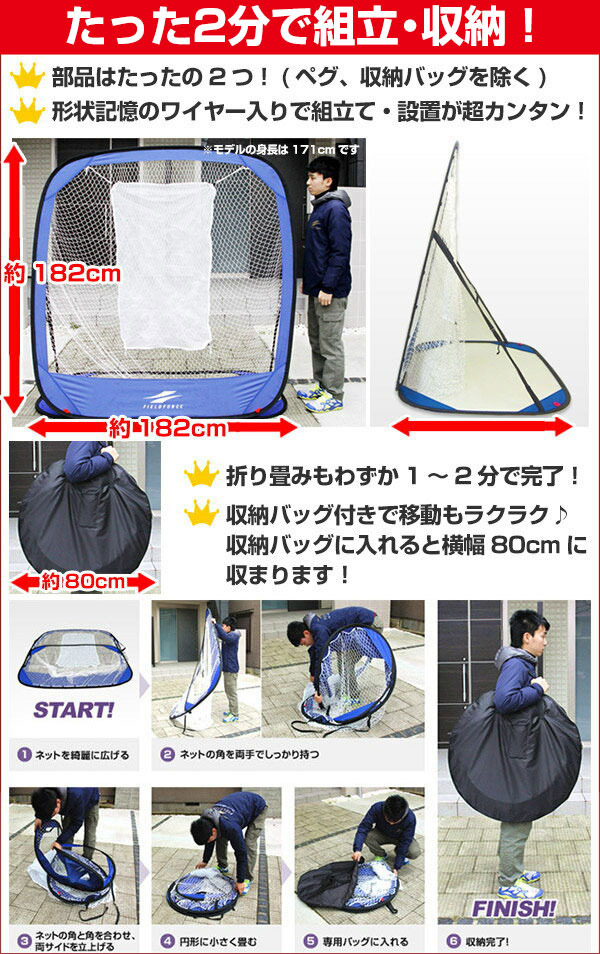 ●サイズ:縦約182cm×横182cm×奥行101cm ●重さ:約5kg ●素材:フレーム:スチール ネット:ポリエチテル ●中国製 【検索キーワード:FIELDFORCE 軟式野球 軟球 軟式球 軟式ボール M号対応 ソフト3号 ソフト2号 ソフト1号 一般用 大人用 少年用 ジュニア用 練習用品 練習道具 練習用具 特訓グッズ トスバッティング トスネット ティーバッティング ティー打撃 チーム 部活動 学校 折り畳み 折畳 FBN-1819N2 FBN1819N2 】 【おもちゃ 玩具 誕生日 子供 ジュニア キッズ】軟式野球&ソフトボール対応! すぐ使えてすぐしまえる! 自分だけの「専用ネット」で "どこでも"特訓開始! このネットを使った動画はコチラ! ↓↓↓↓↓↓ 実際に使ってみました! よくある質問 ■フレームがねじれてしまった! 特殊な素材を使用しており、形状記憶の性質がございます。